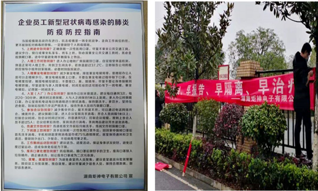 為應對新型冠狀病毒感染的肺炎疫情,落實以企業(yè)防控為主的綜合防控措施,湖南炬神電子有限公司提前謀劃、周密部署,積極做好復工復產(chǎn)前各項準備措施,為早日恢復生產(chǎn),保障社會經(jīng)濟正常穩(wěn)定運行打響了一場全員戰(zhàn)“疫”。